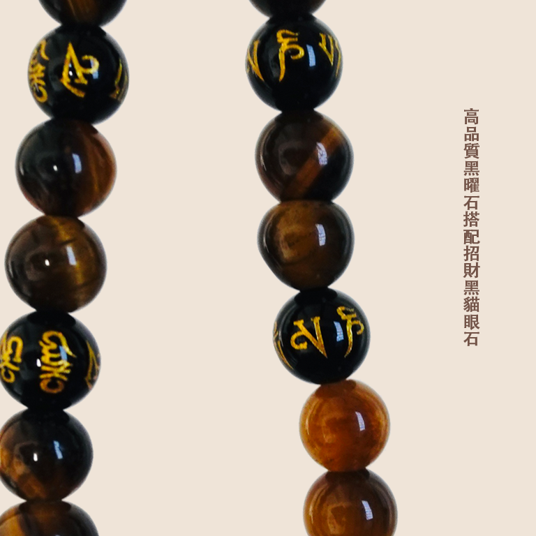 雲星定製珠手機鏈 - 黑曜石搭配招財黑貓眼石 - 平安健康符搭配六字真言